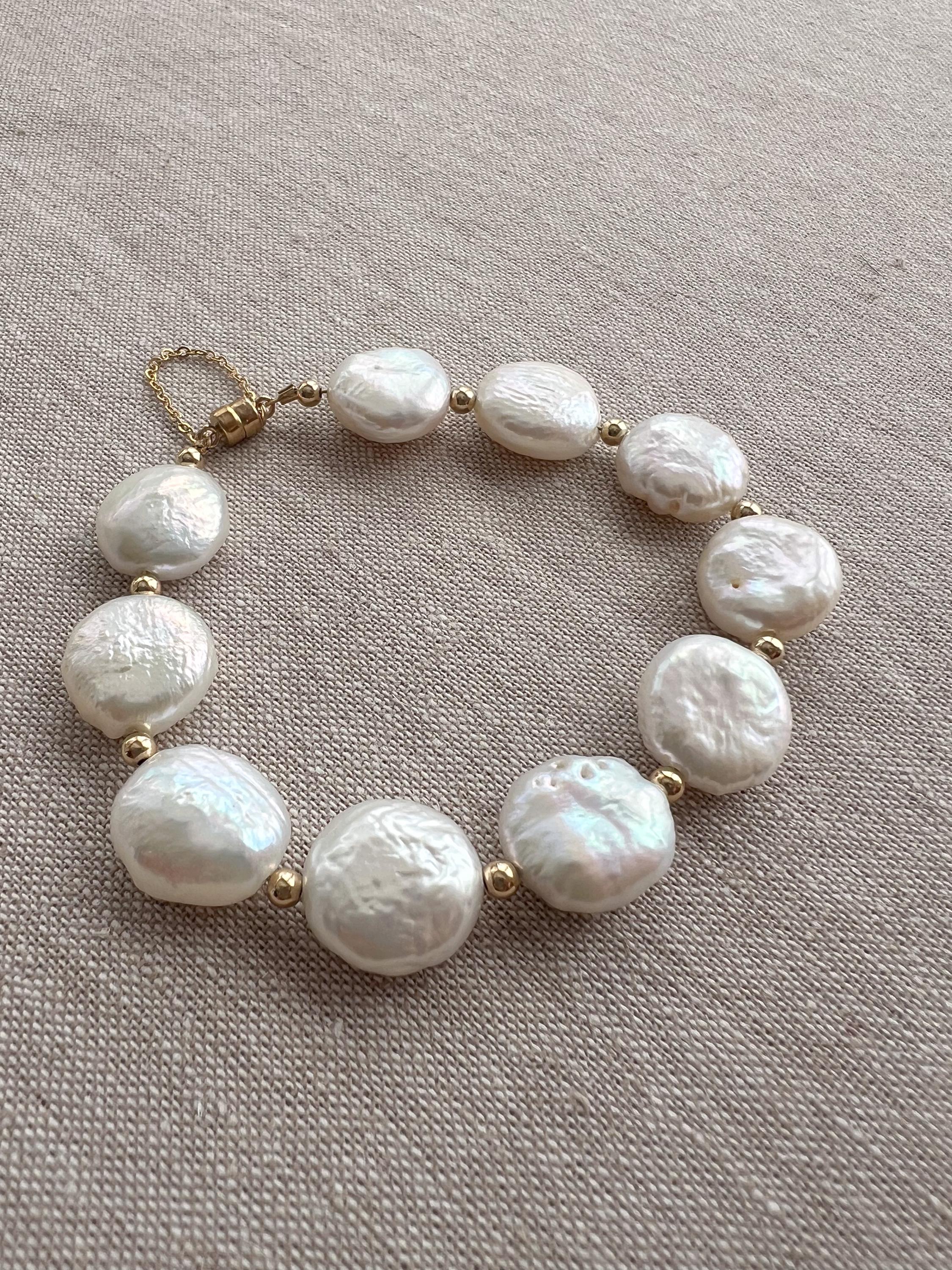 Timeless bracelet made with 12x7mm natural Freshwater coin pearls with 3mm 14k gold filled accent beads. The bracelet is finished with a 14k gold filled magnetic clasp with a safety chain. The length is 7" but can be made to your specific size. The pearls are white AA+ grade with a nice luster to them. A classic bracelet that will always be in style