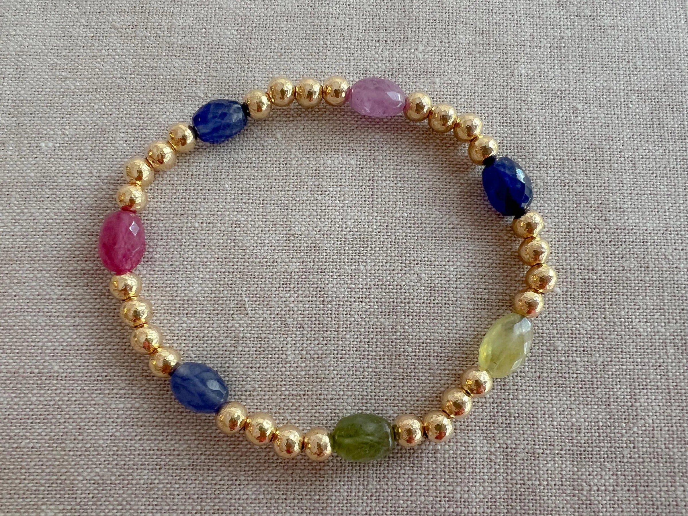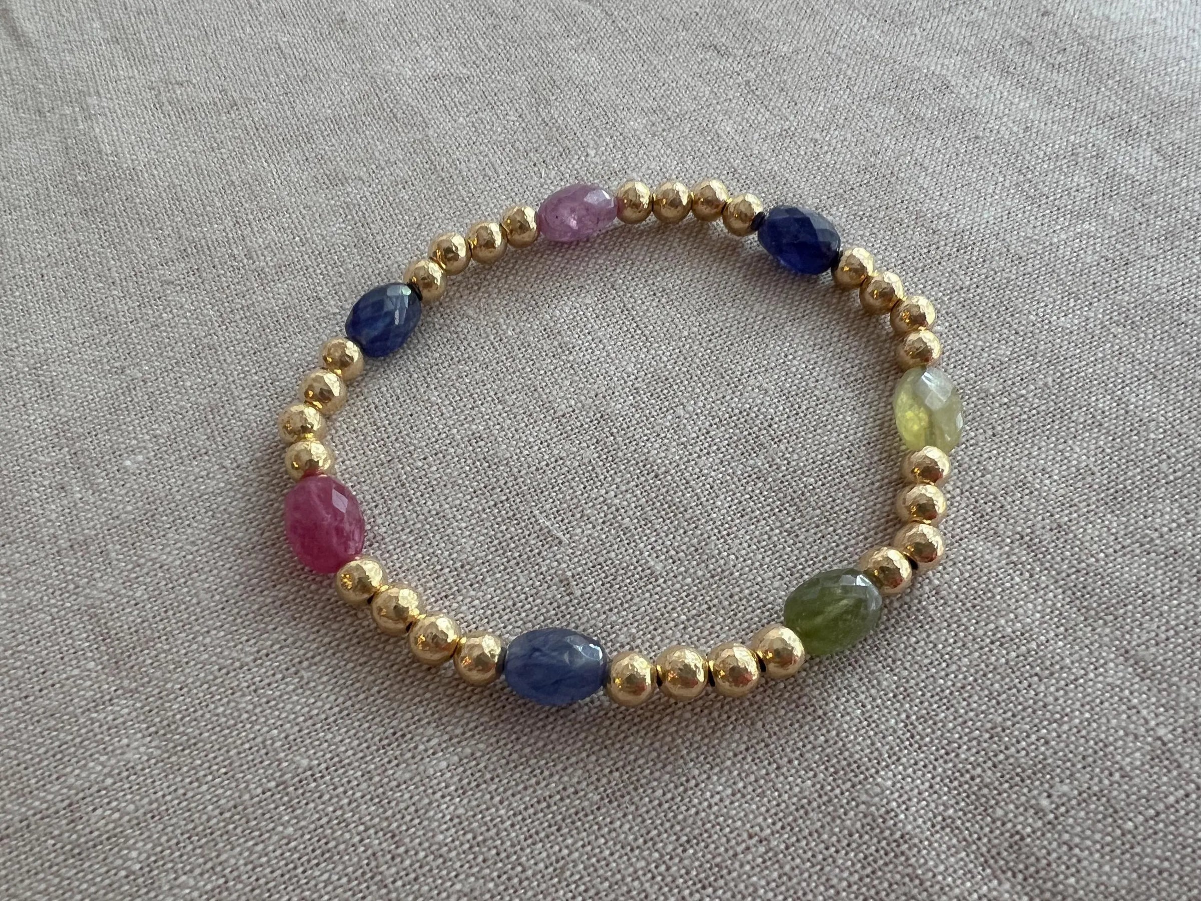 Dainty bracelet of 10x7mm AAA faceted oval multi colored Sapphires with hammered round 2.5mm 14k gold filled 5mms beads. The bracelet is on stretch cord and is 6.75" in internal circumference. The hammered 14k gold filled beads have more sparkle than smooth round beads so it catches the light nicely. This is a very nice bracelet to wear on its own or stack with other bracelets.