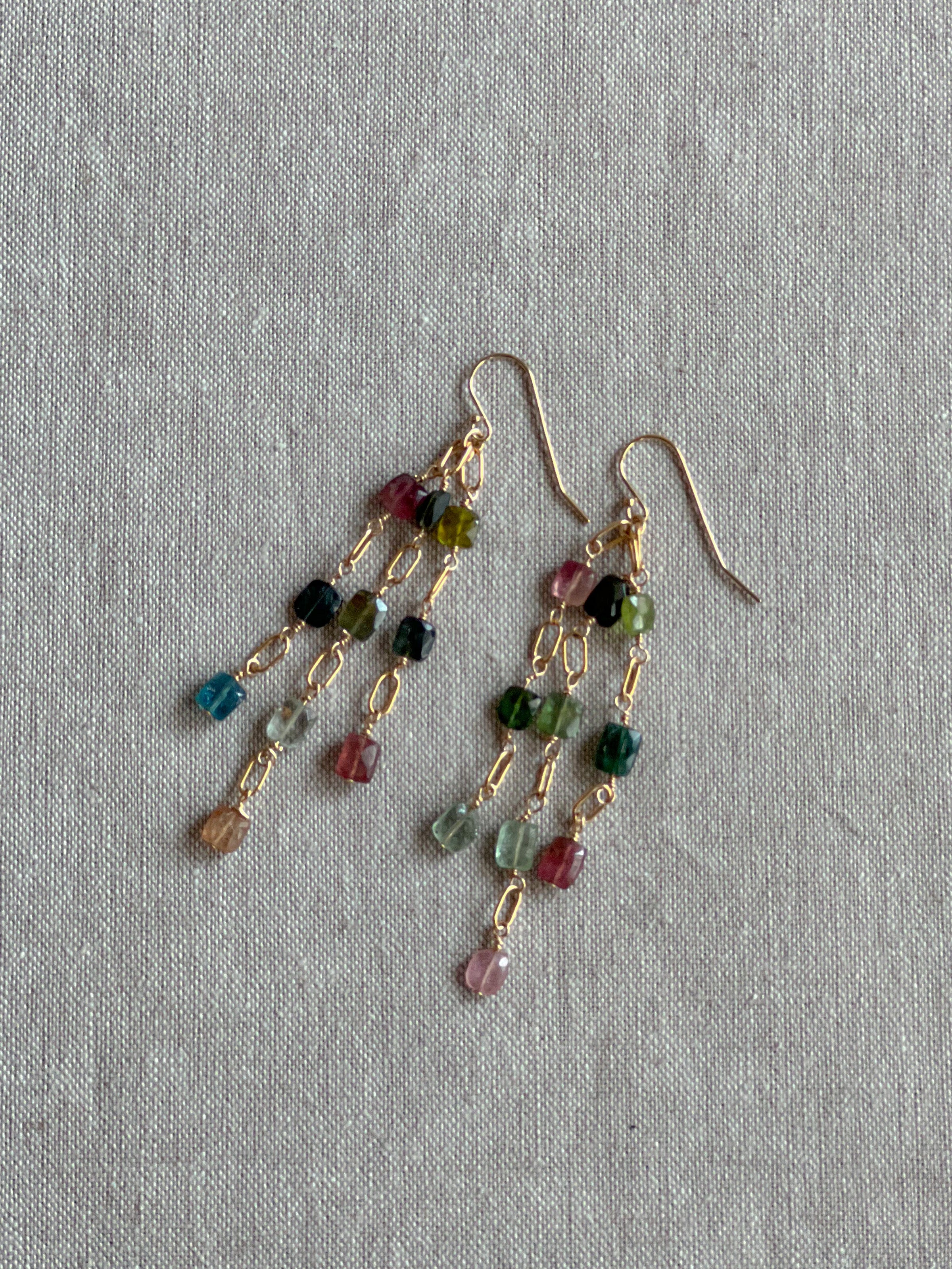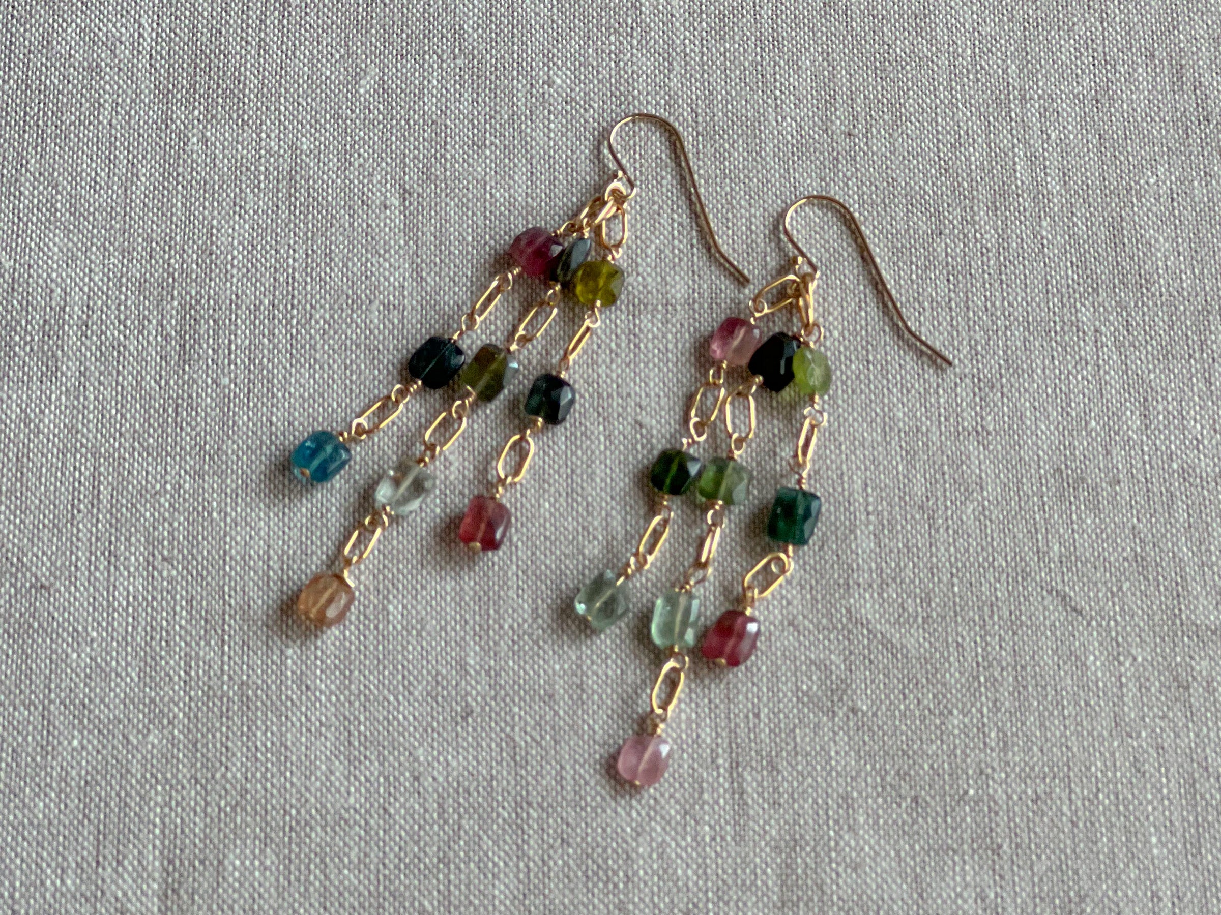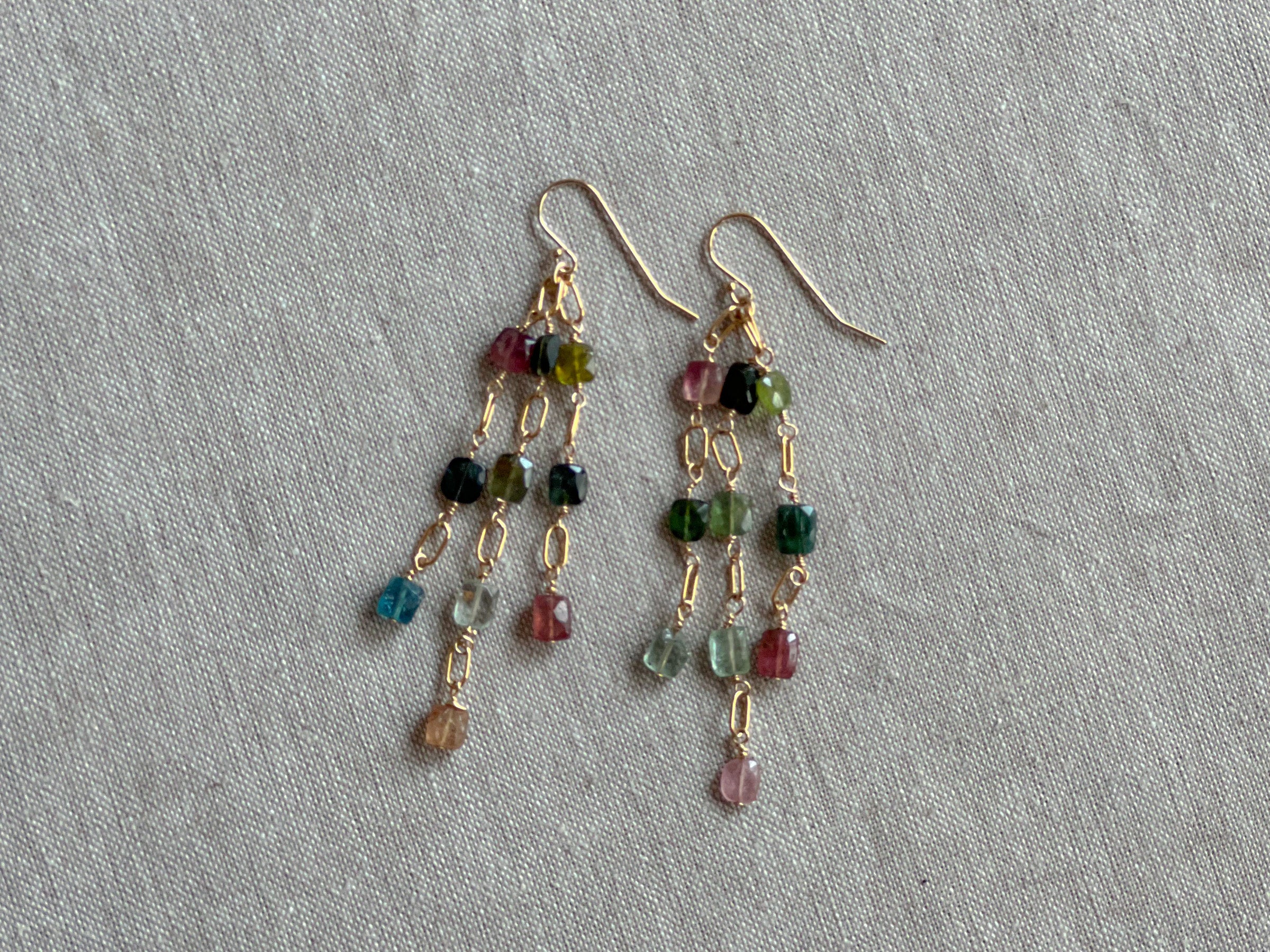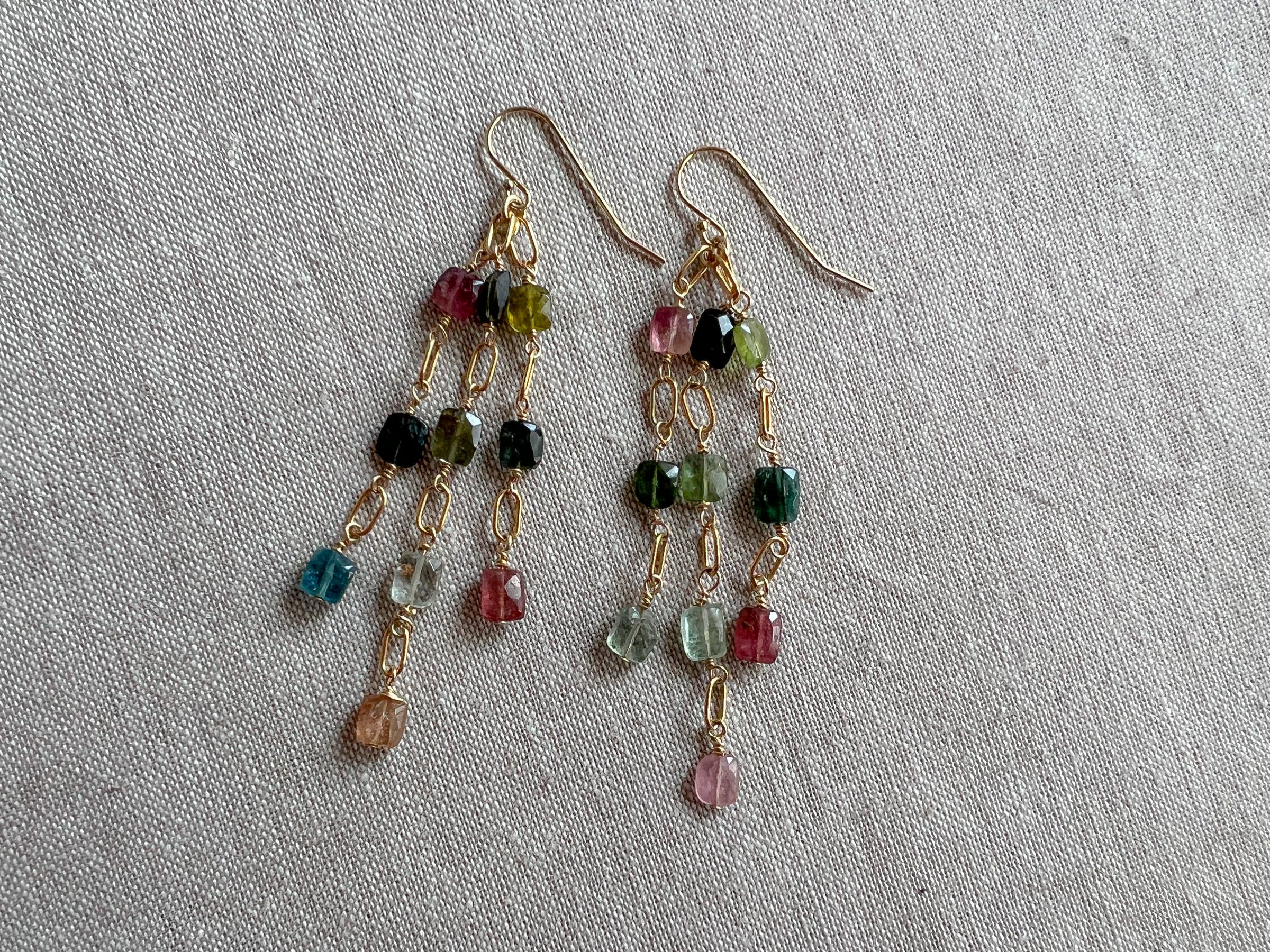 Beautiful earrings made with faceted chingam cut AAA multi colored Tourmalines wire wrapped on gold filled components. Gold filled earring wire that won't irritate skin. Length is 2.75" from the earlobe. These earrings are so perfect for Fall. I love the colors in Tourmaline. I hope you like these little delicate but eye catching earrings!