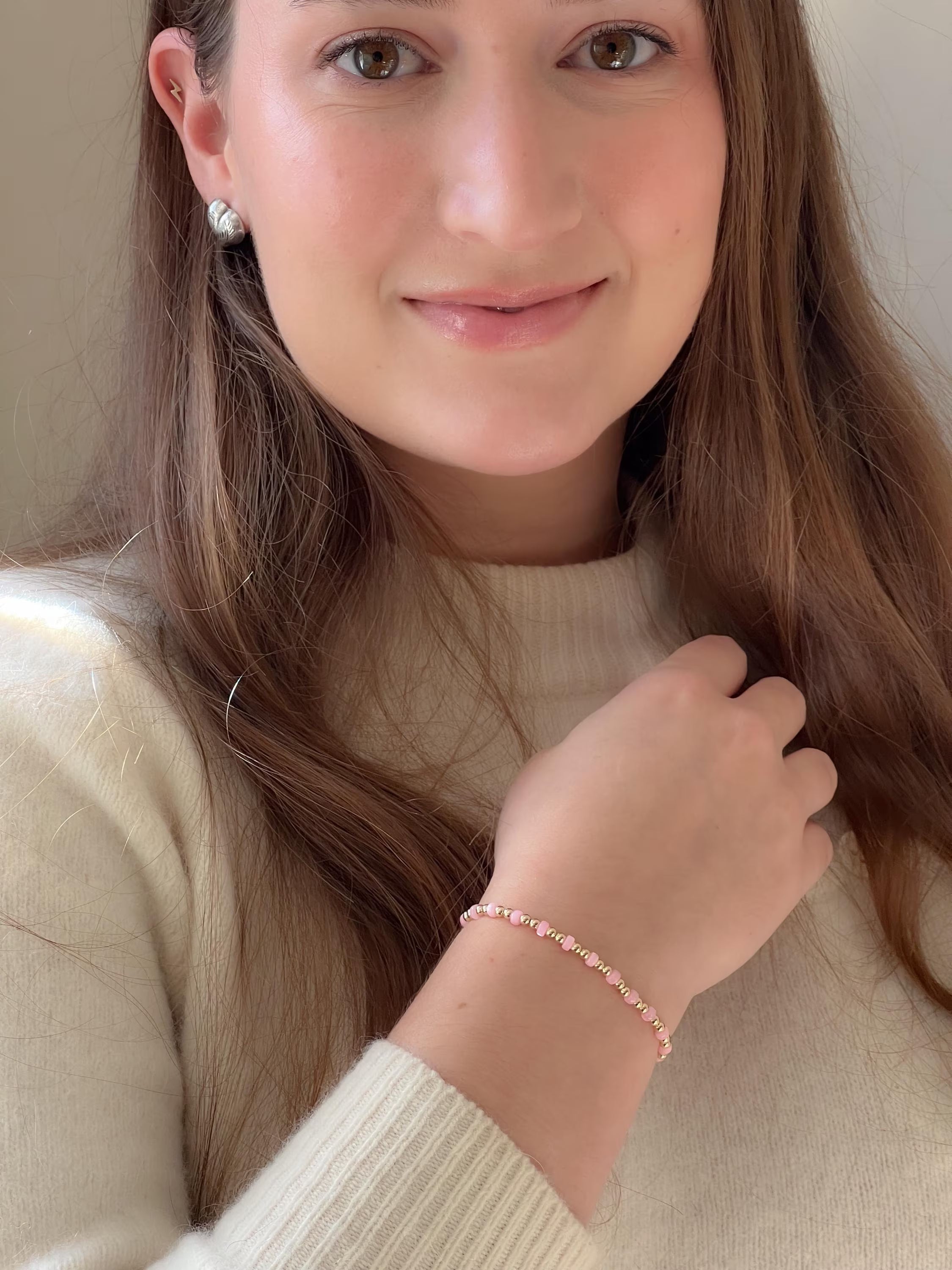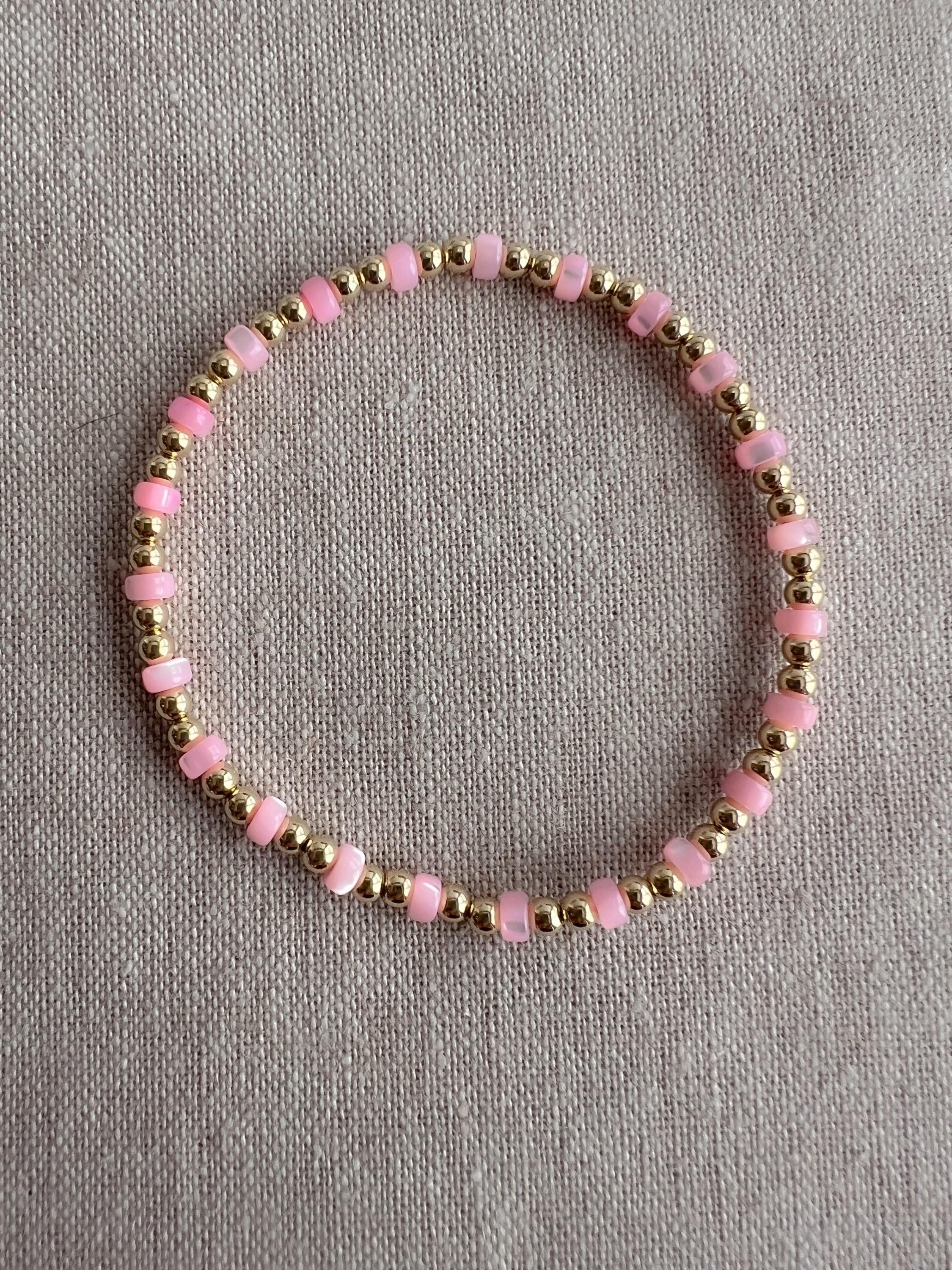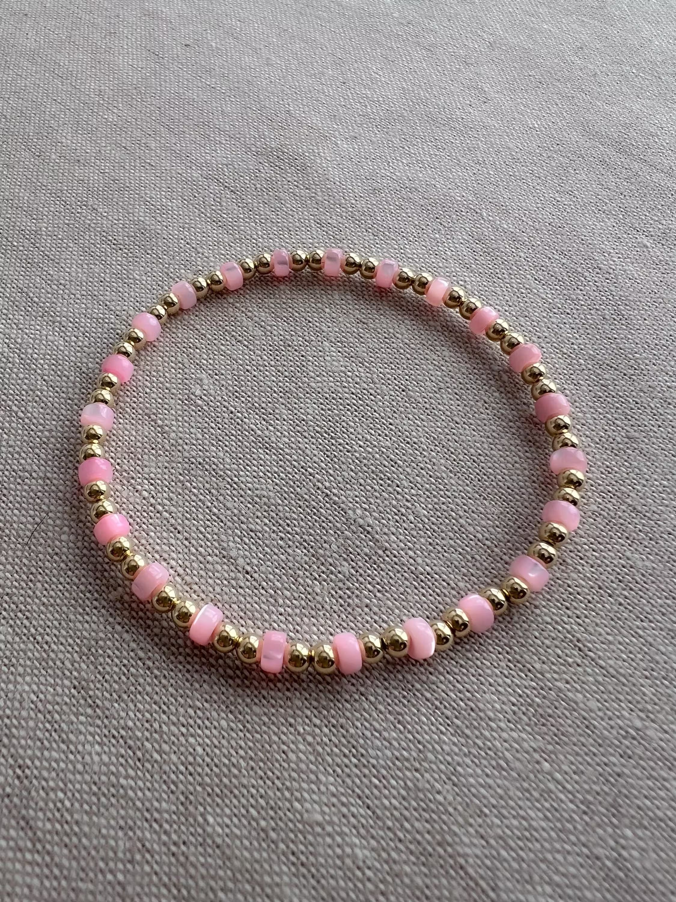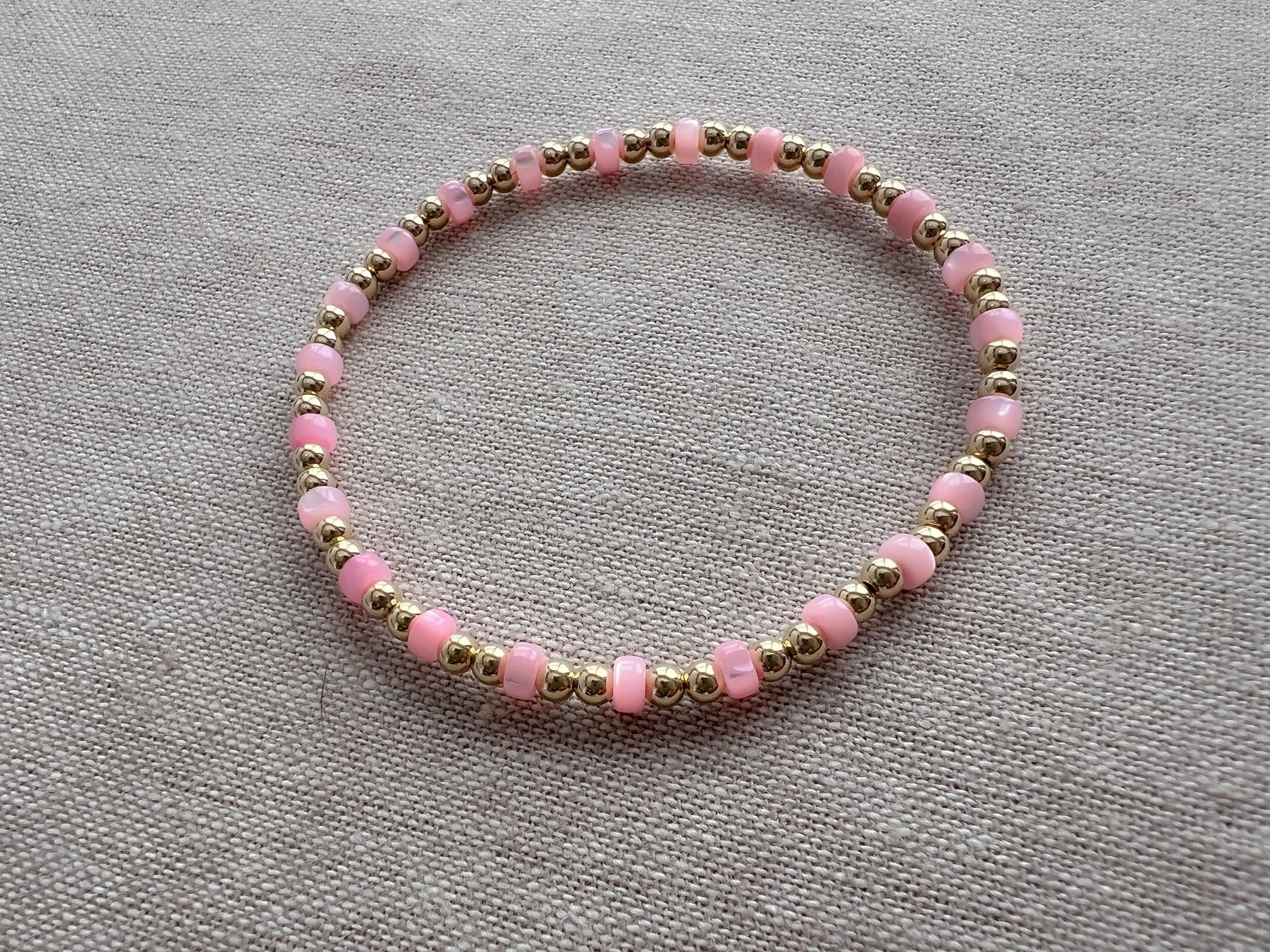 Dainty bracelet made with 3mm 14k gold filled smooth round beads accented with 4mm smooth pink Shell Pearl rondelles on stretch cord. The sizes vary. See note below. The Shell Pearl is a lovely soft pink color. This bracelet is great for stacking with other bracelets but can also be worn all by itself. I included an image of the bracelet stacked with others for reference.