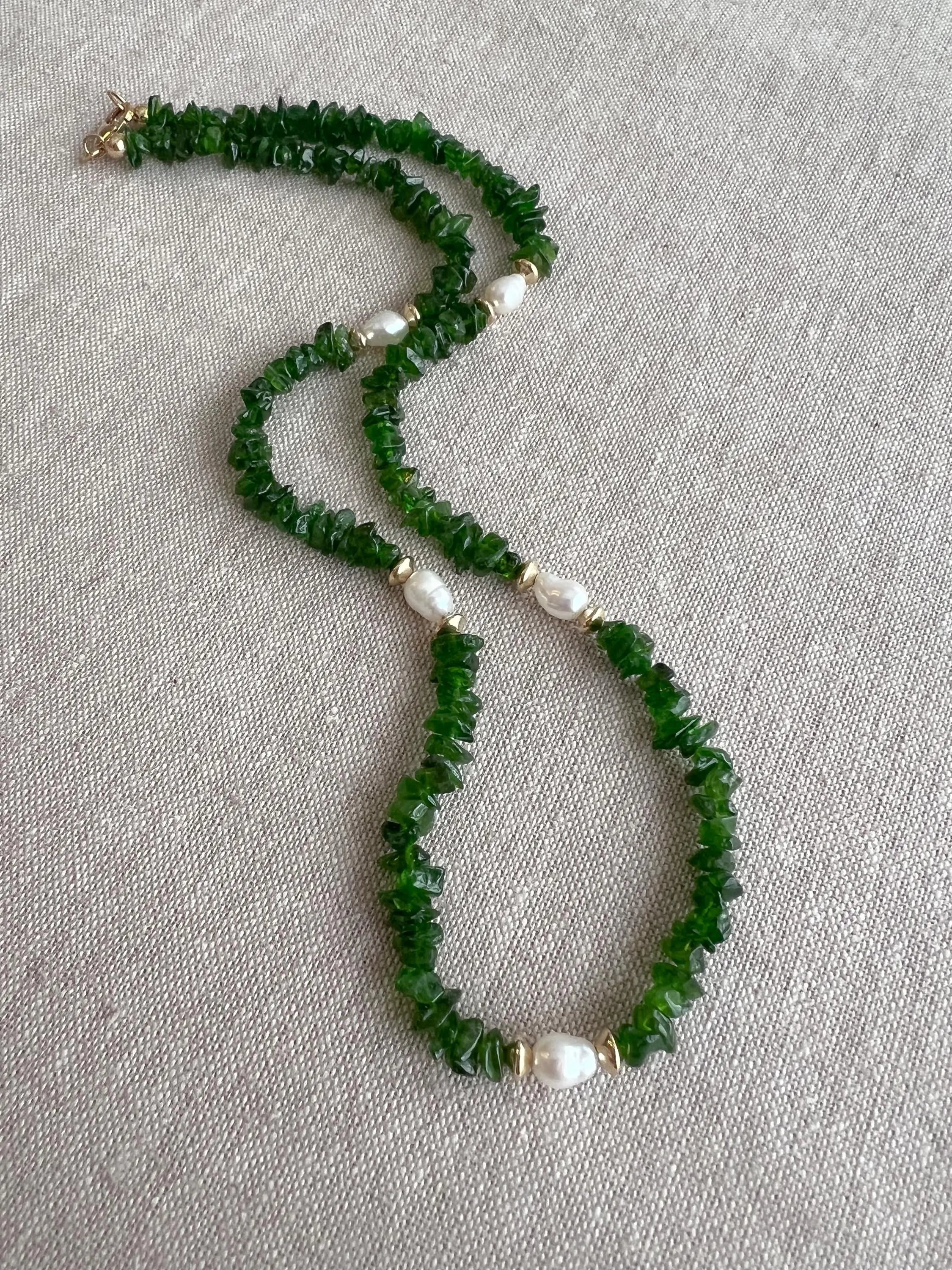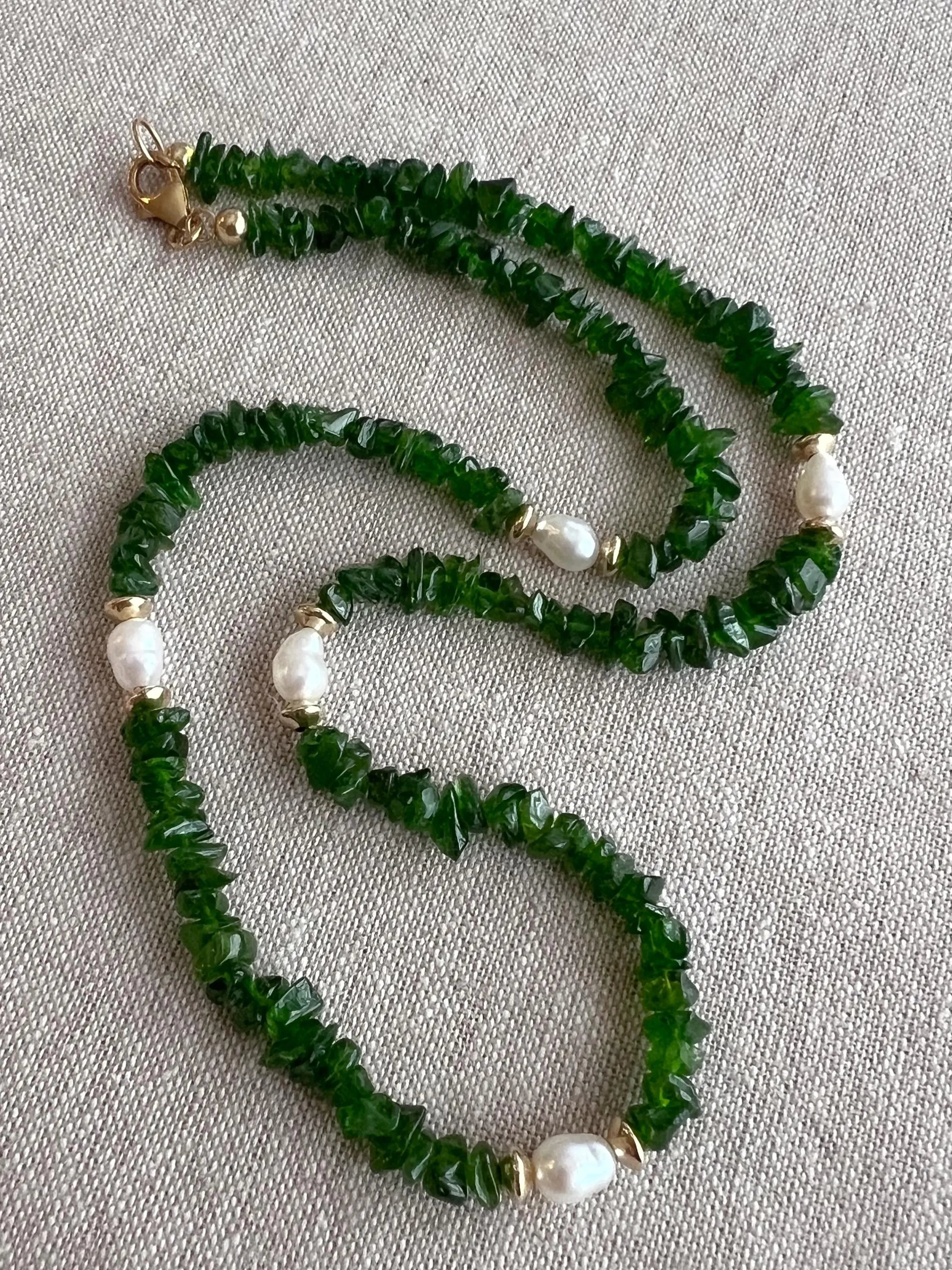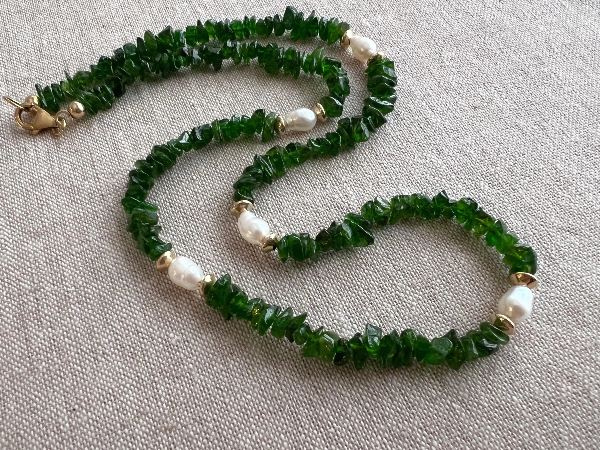 Lovely necklace made with Chrome Diopside chips accented with Freshwater small Baroque Pearl stations.  The Baroque Pearls are cushioned by 14k gold filled saucers.  The small Baroque Pearls have a high luster. The necklace is 17" in length and finished with a 14k gold filled lobster clasp.  The size of the Chrome Diopside beads is 4-5mm and the color is a rich green and AA grade.  A classic necklace that will be worn for years to come!
