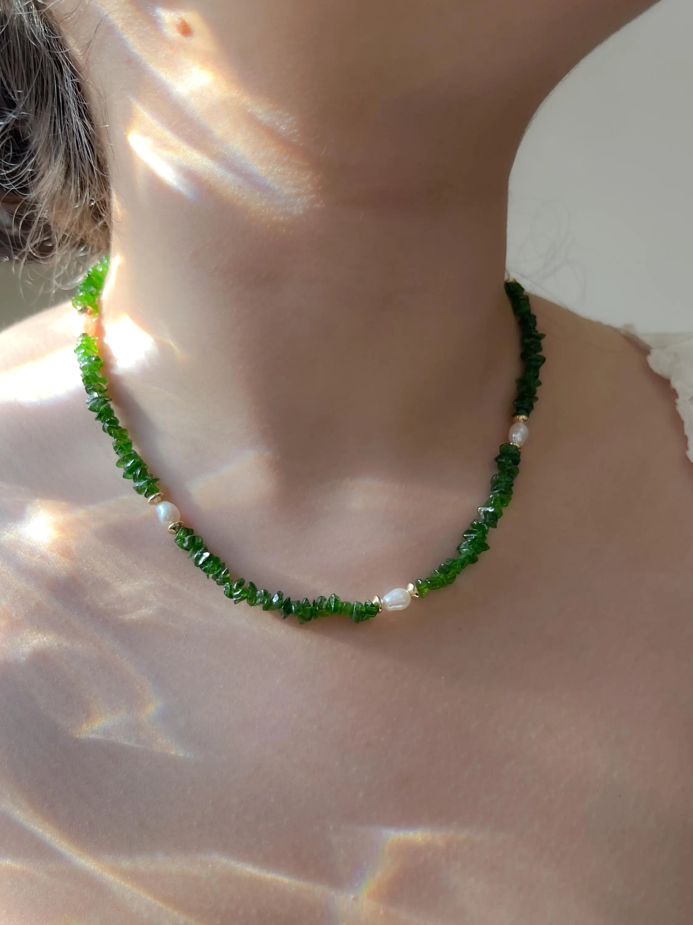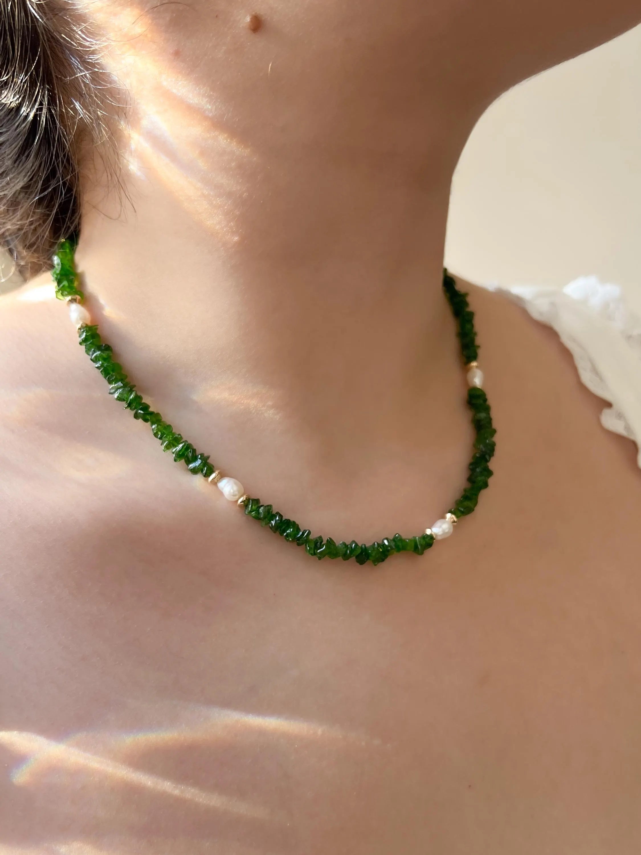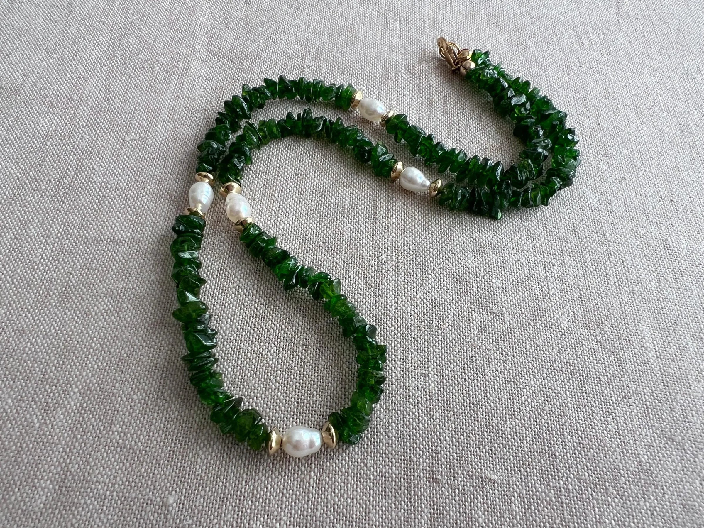 Lovely necklace made with Chrome Diopside chips accented with Freshwater small Baroque Pearl stations.  The Baroque Pearls are cushioned by 14k gold filled saucers.  The small Baroque Pearls have a high luster. The necklace is 17" in length and finished with a 14k gold filled lobster clasp.  The size of the Chrome Diopside beads is 4-5mm and the color is a rich green and AA grade.  A classic necklace that will be worn for years to come!