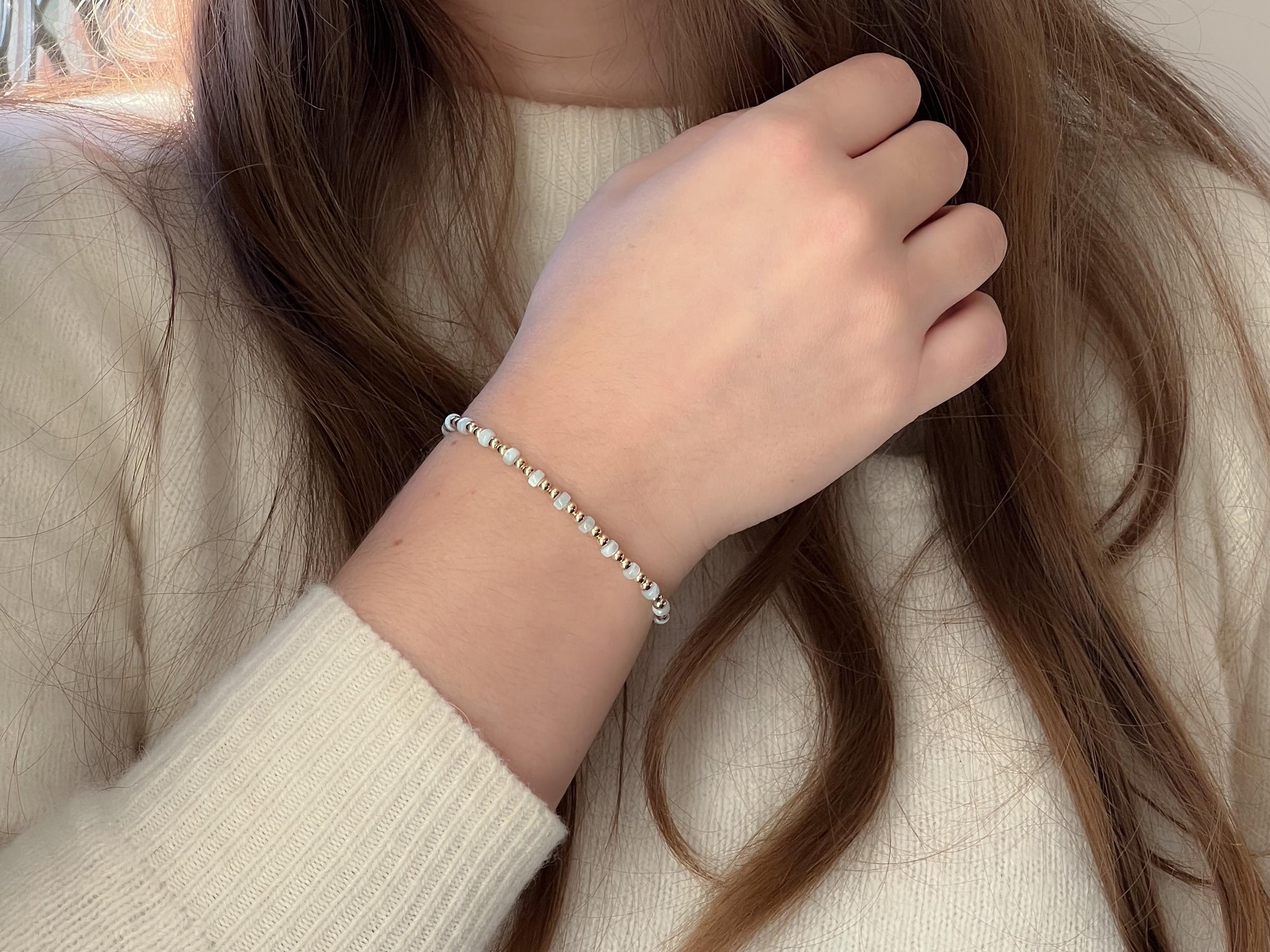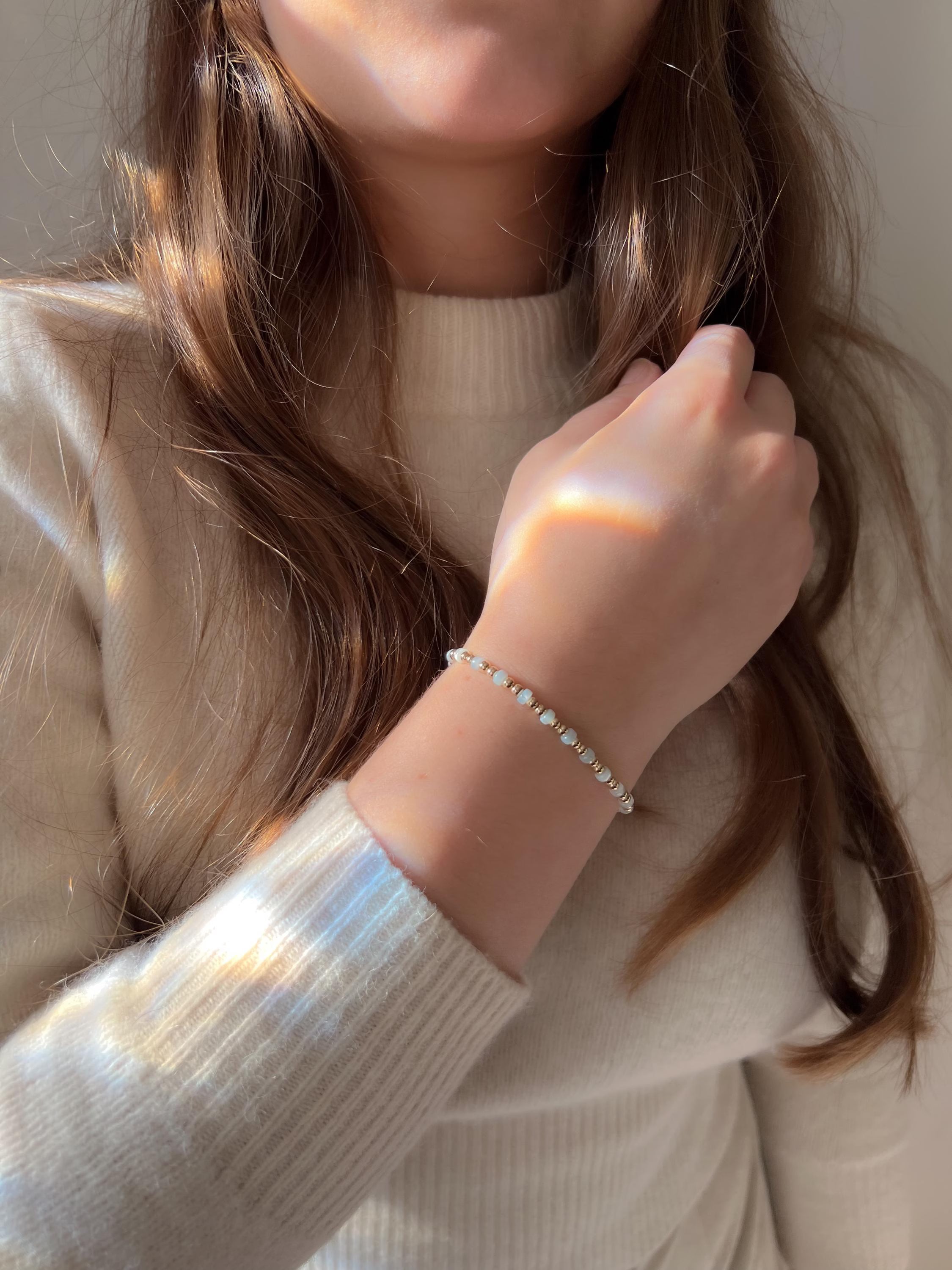 Dainty bracelet made with 3mm 14k gold filled smooth round beads accented with 4mm smooth soft blue Shell Pearl rondelles on stretch cord. The sizes vary. She note below. The Shell Pearl is a lovely soft blue color making it a nice neutral. This bracelet is great for stacking with other bracelets but can also be worn all by itself.