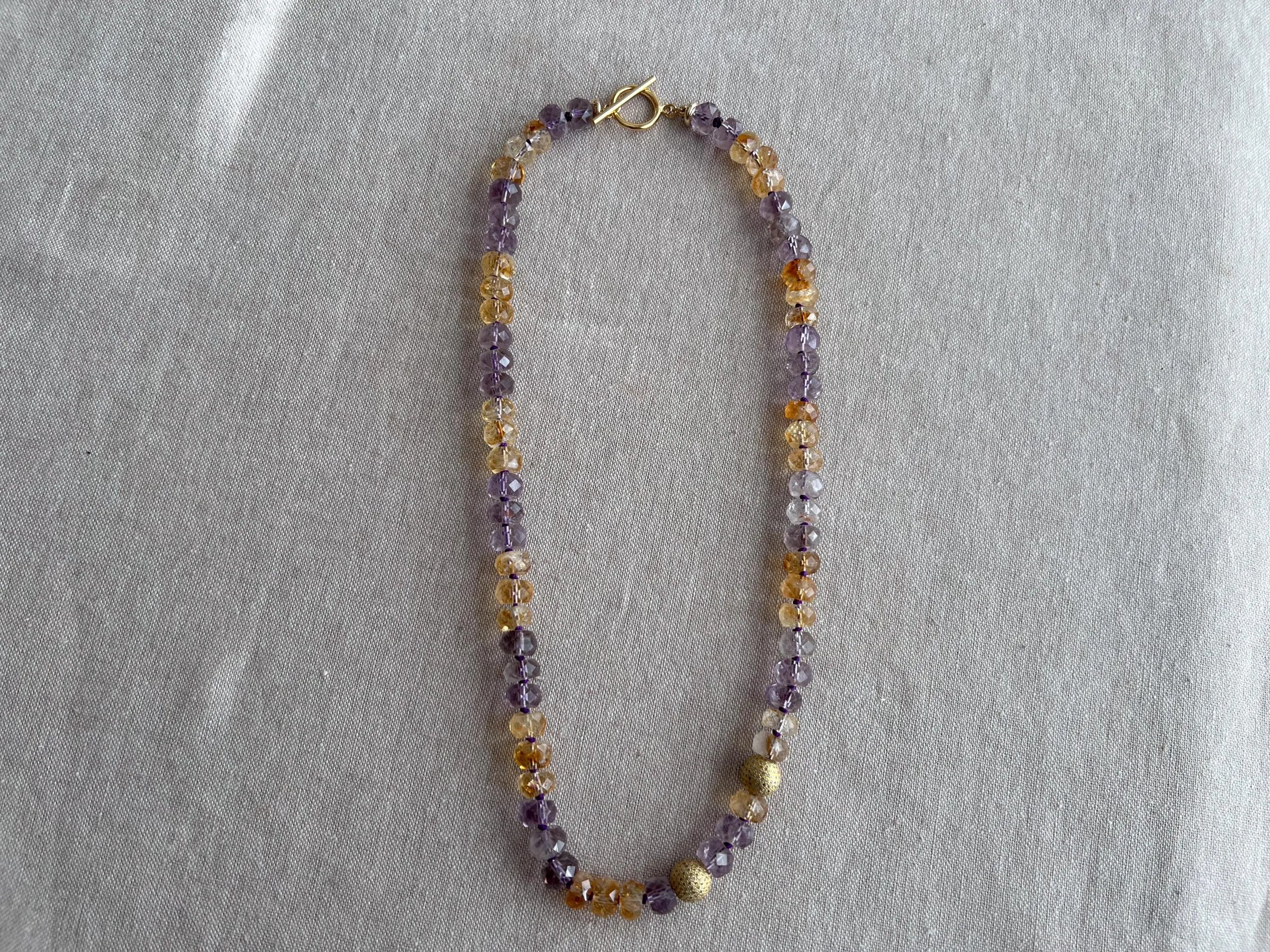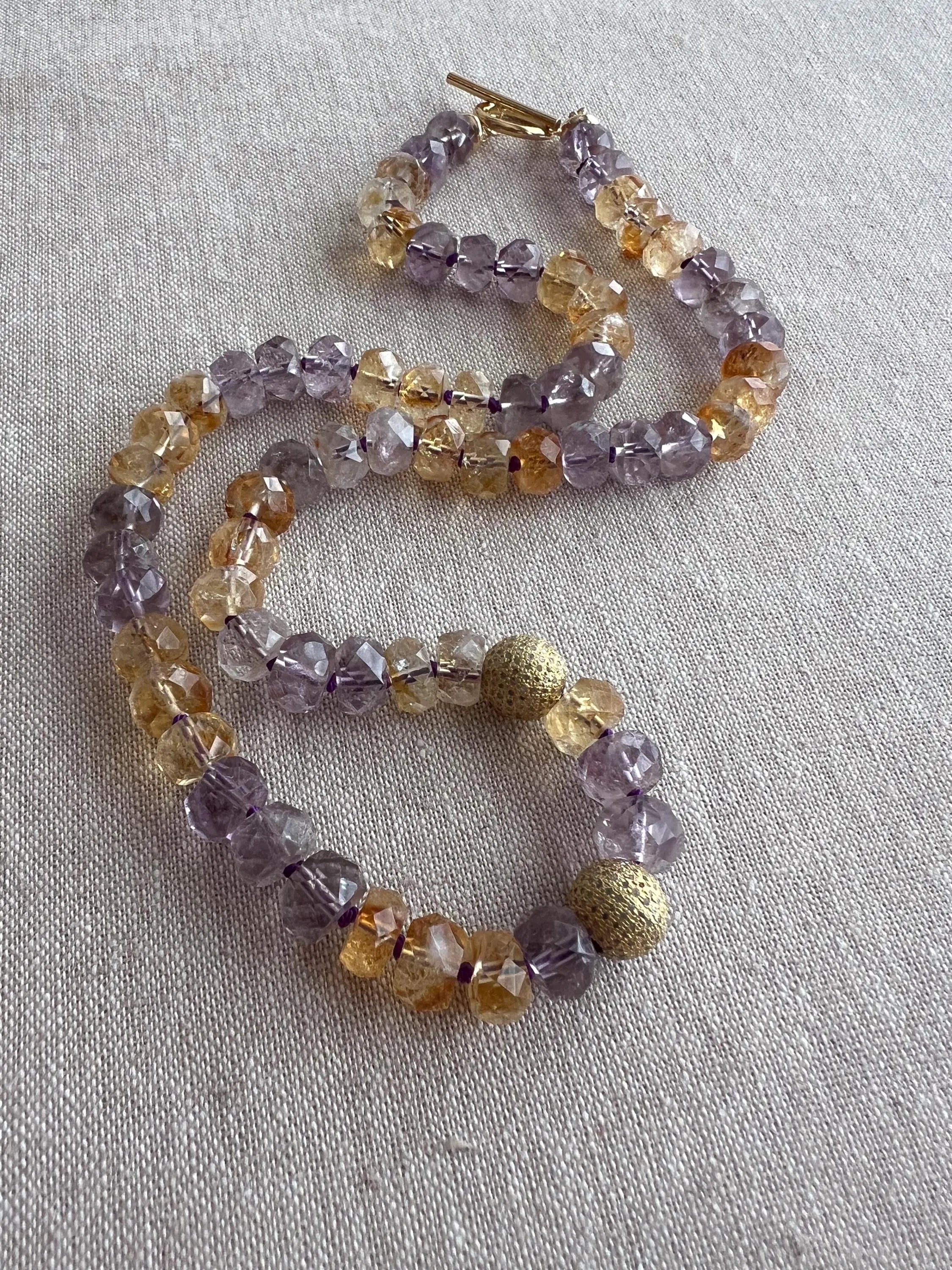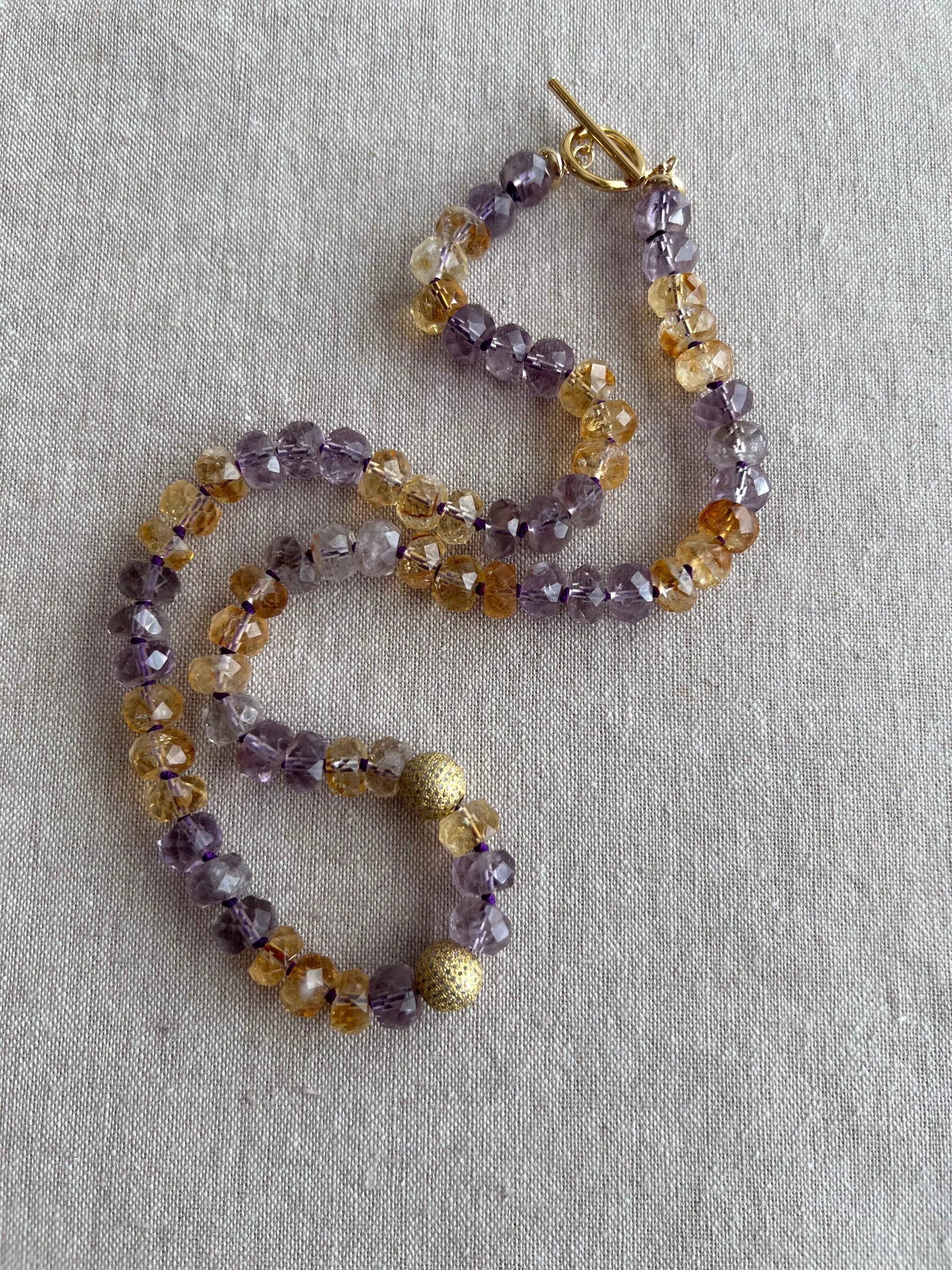 Elegant necklace made with AA+ faceted Ametrine rondelles hand knotted on purple silk and accented with 2 off center 10mm pave diamond on gold vermeil round beads. The Ametrine rondelles are 10mm in size and are AA+ quality with good translucency and color. The length of the necklace is 20" and it is finished with a 14k gold filled toggle clasp and 14k gold filled finishing components. I love Ametrine and that is a unique combination of Amethyst and Citrine that comes from Bolivia. Ametrine is a beautiful gemstone that is lovely to wear any time of the year.