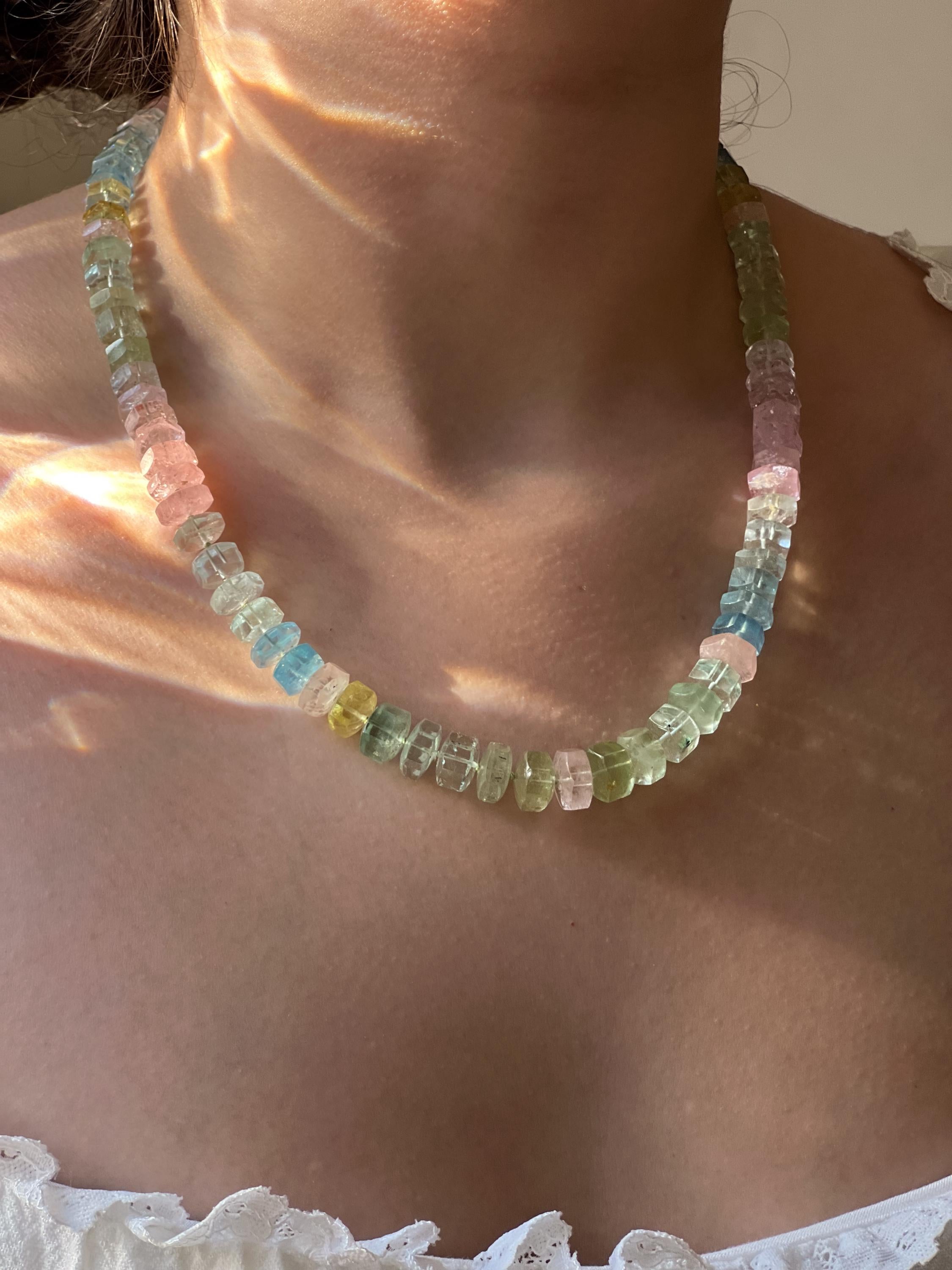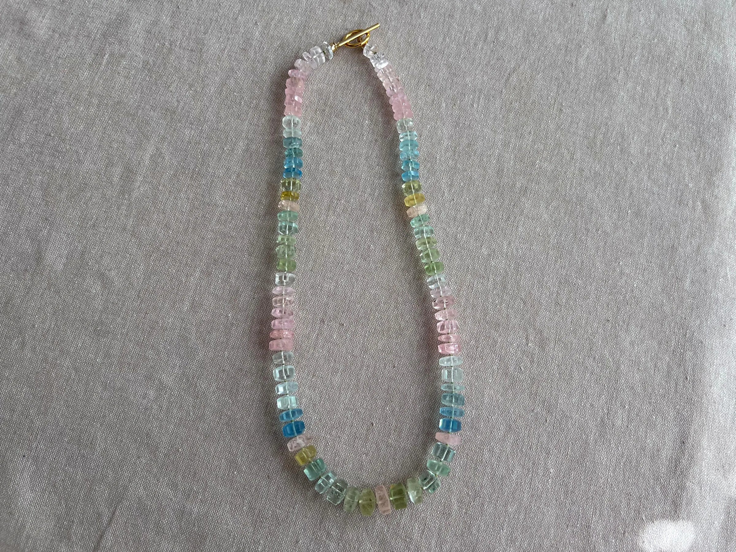 Statement necklace made of AAA Aquamarine and Morganite faceted bolts. The stones are gently graduated from 8mm to 11mm in size. The colors of the Aquamarines are shades of blue, yellow and green and have very few inclusions and are transparent. The Pink Morganite is of high quality and is translucent with many of the stones being transparent. The stones are hand knotted on light green silk to a length of 19.5". The necklace is finished with a 14k gold filled smooth toggle clasp. The shape of the stones reminds me of the candy necklaces we used to get as kids. This is a high quality necklace that will last through the years and be passed on to future generations. It is beautiful to wear any time of the year and is sure to be noticed!