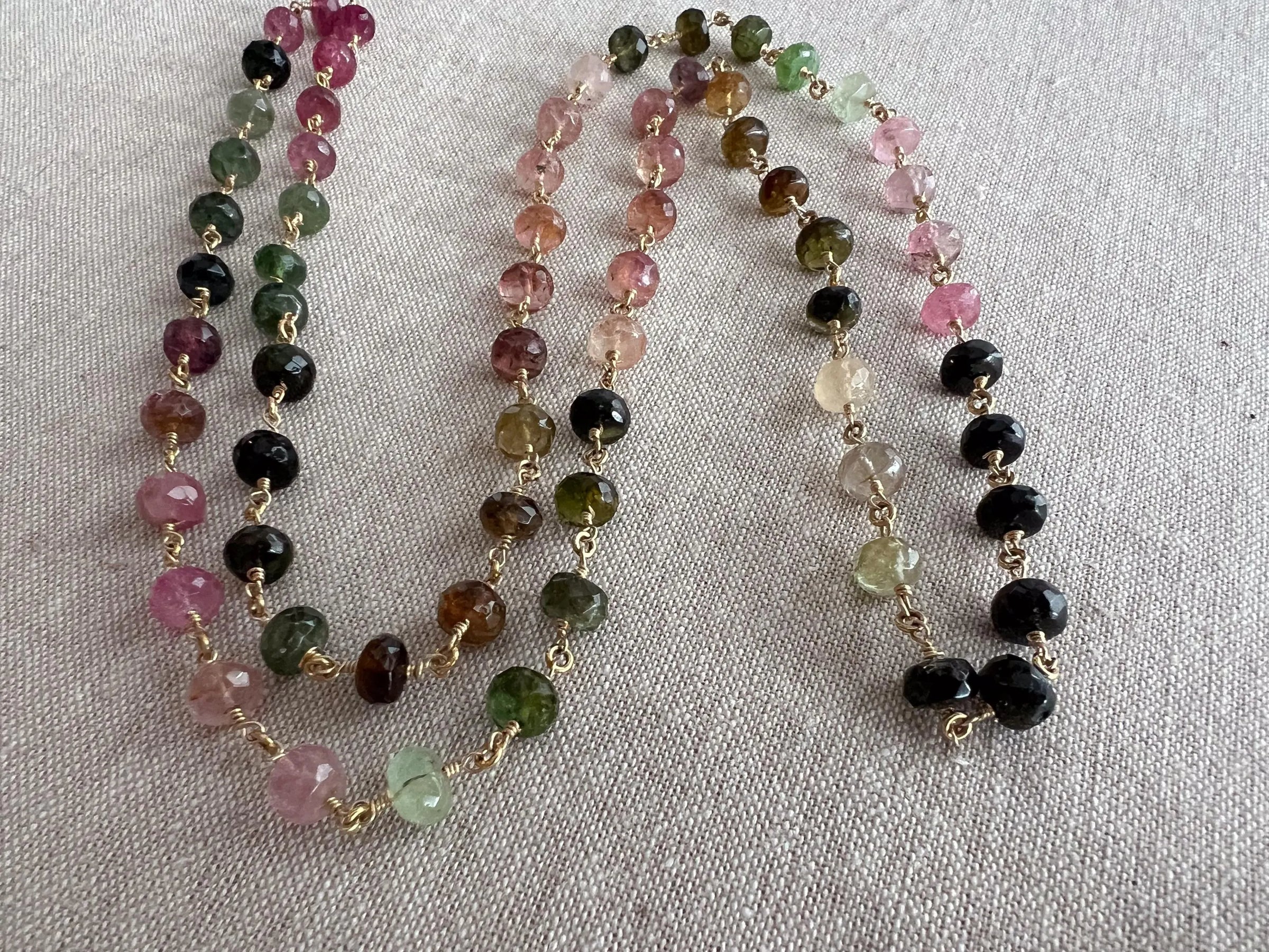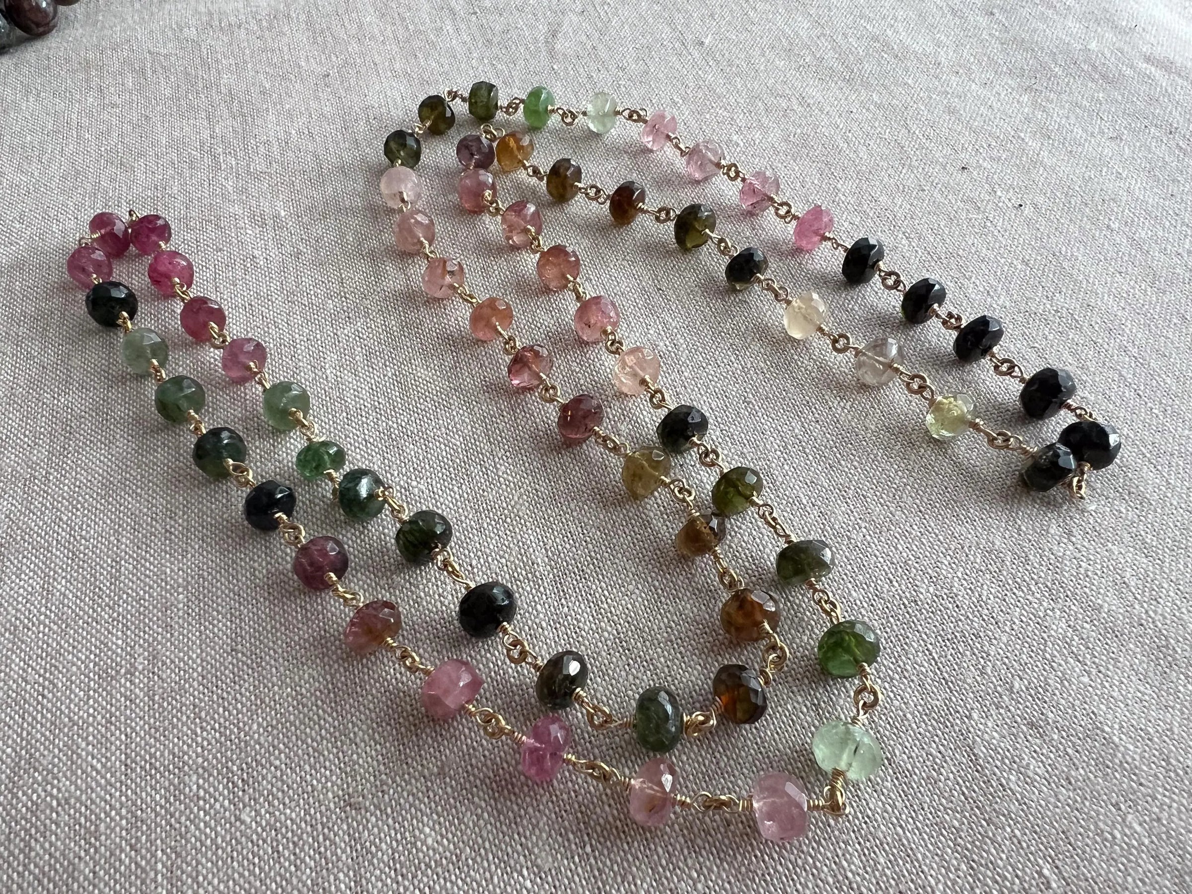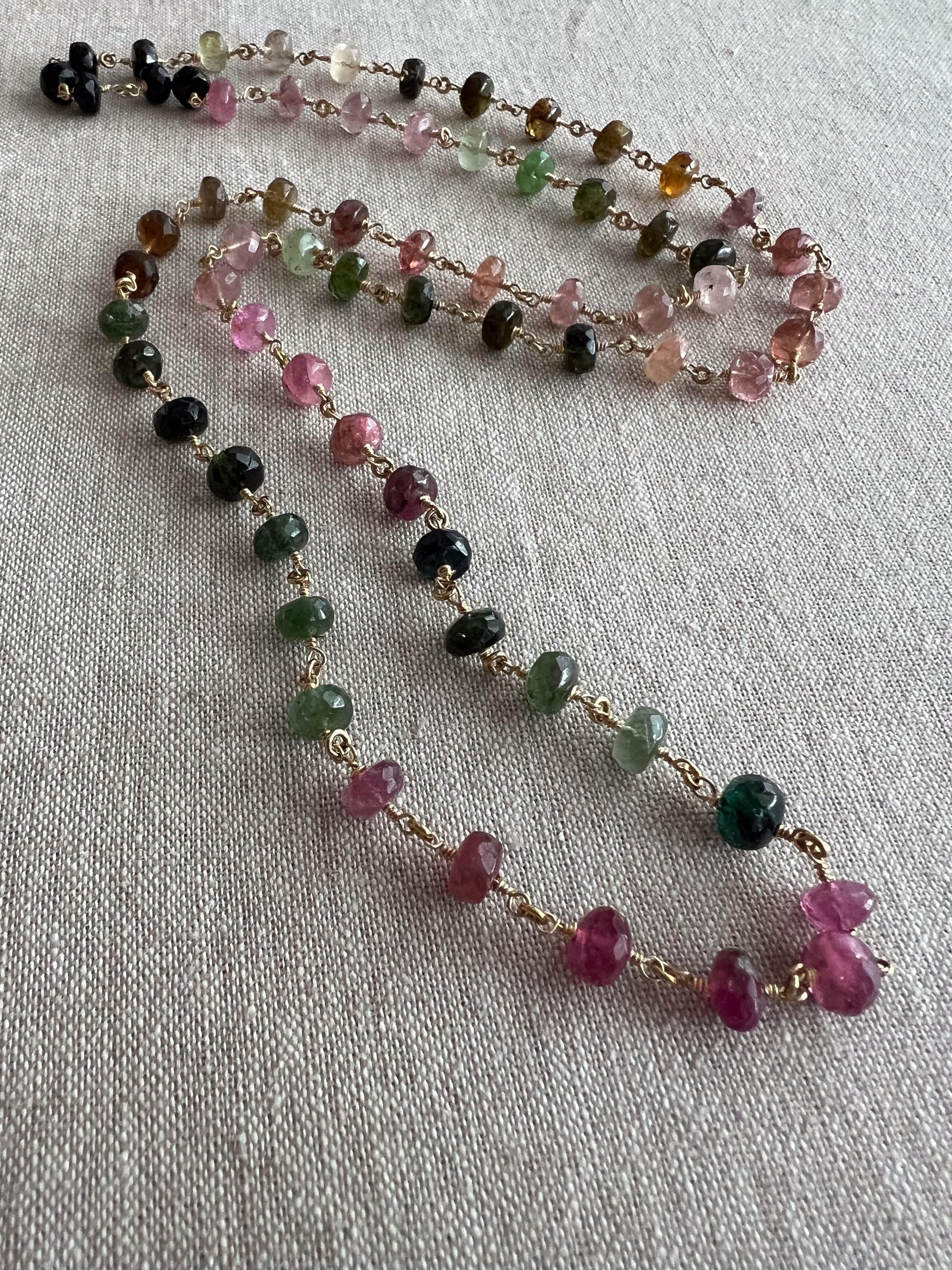 Classic necklace of multi color Tourmaline faceted rondelles wire wrapped with 14k gold filled 26g wire to a length of 34". The Tourmaline is AA+ grade and translucent in color. The colors include black, green, pink, brown and deep blue. The size of the stones is 7mm. I used a small jump ring between each loop to prevent the necklace from "kinking" and give it a very nice drape. This is a lovely classic style of necklace made with beautiful Tourmaline stones that is lovely to wear any time of the year for years to come.