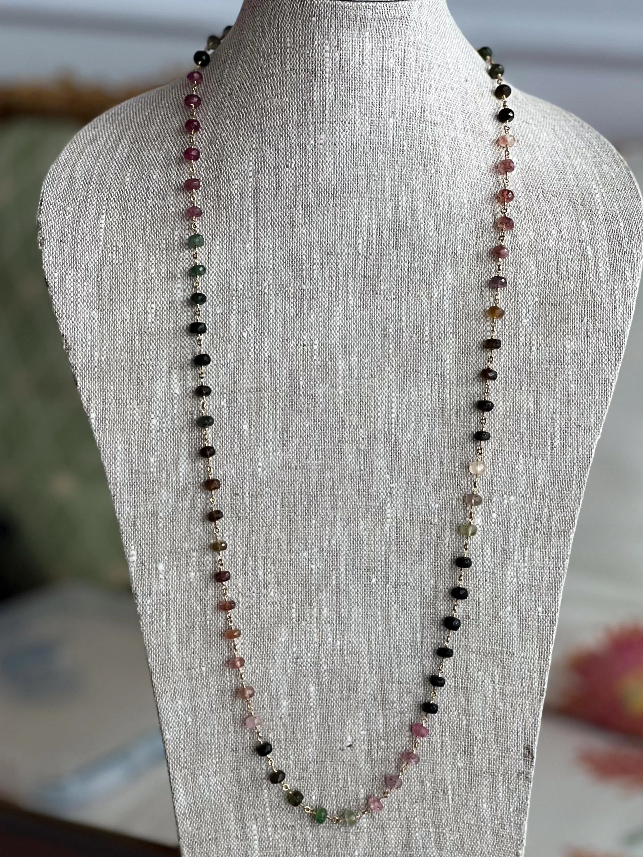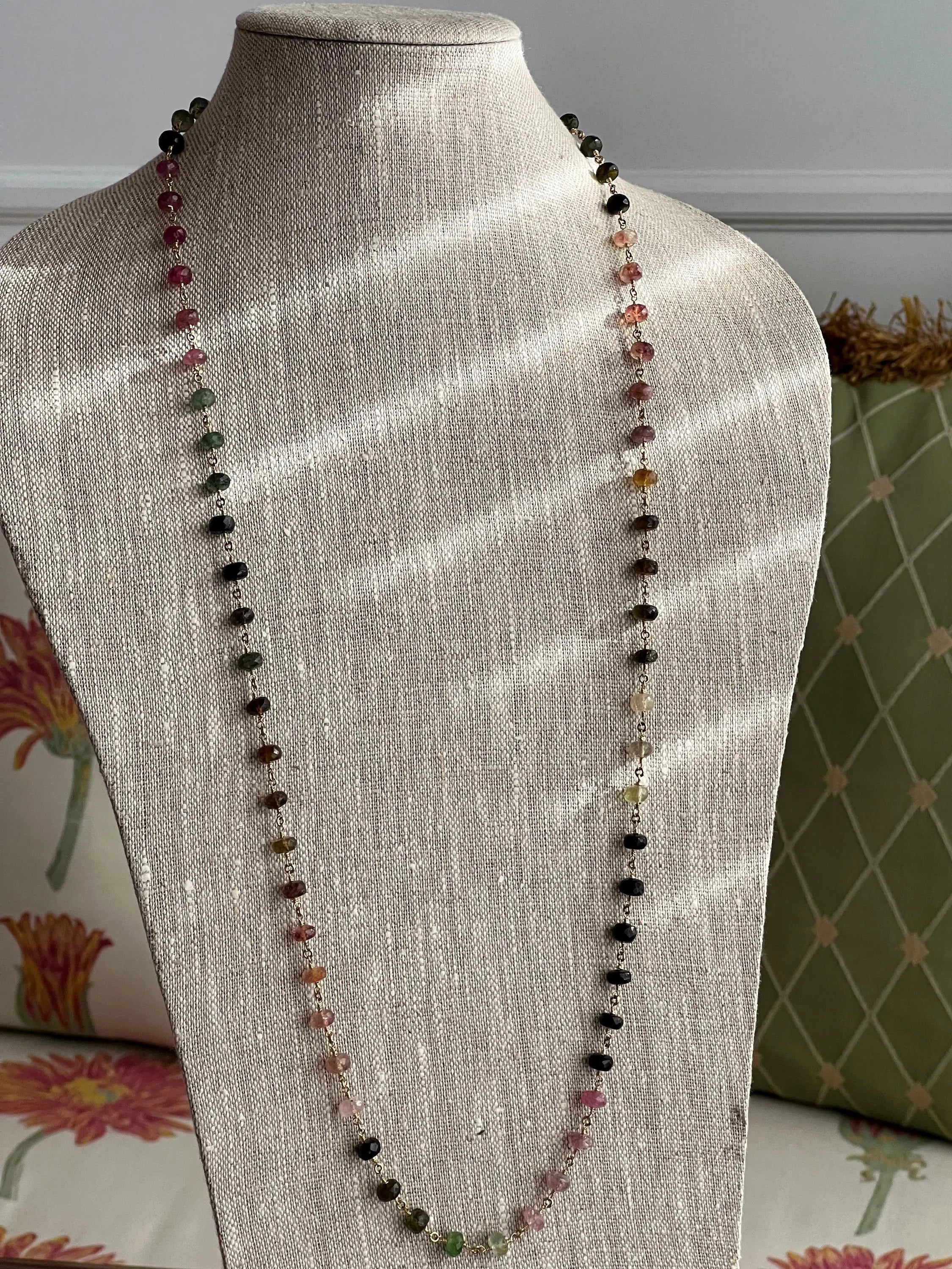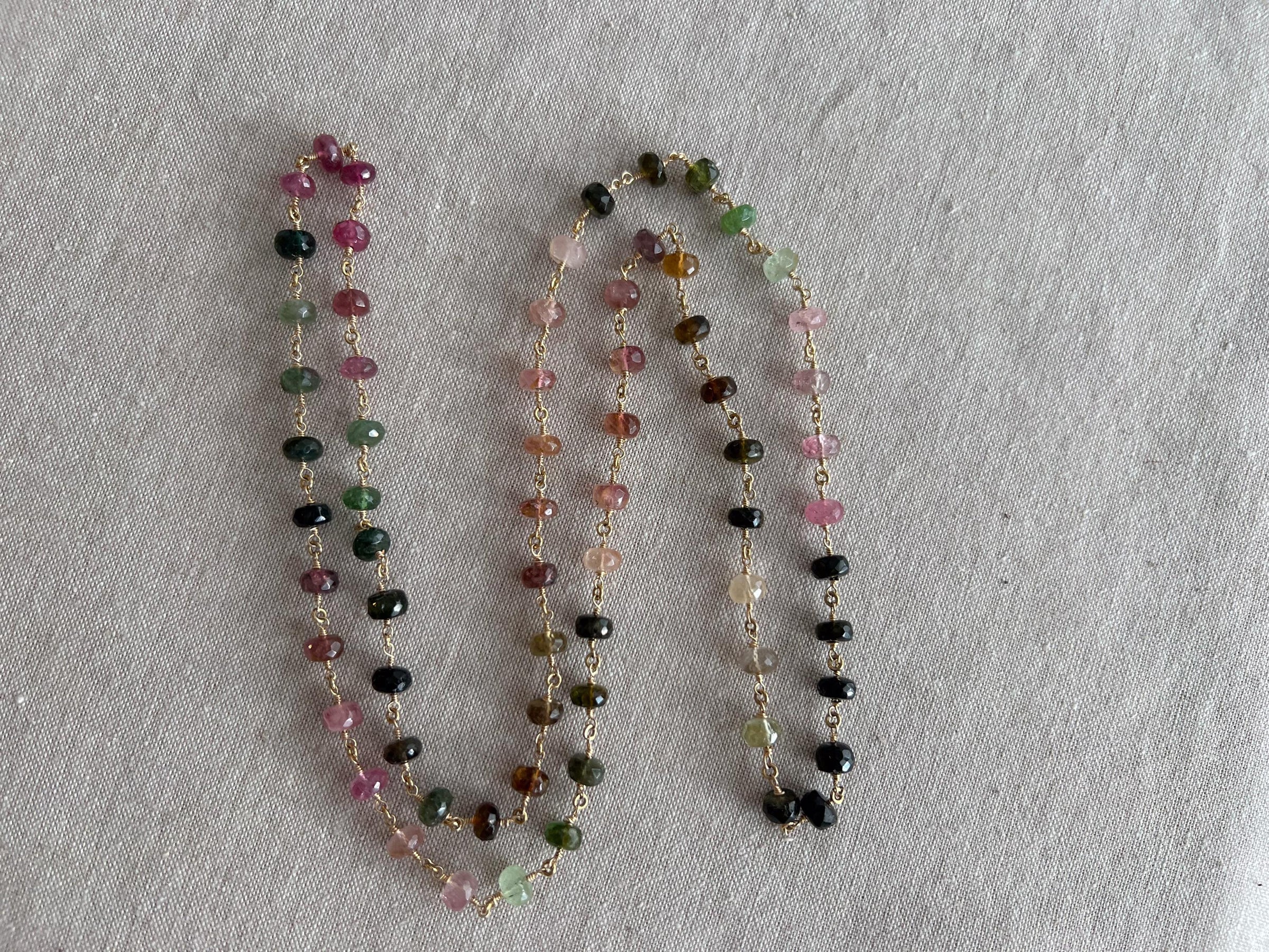 Classic necklace of multi color Tourmaline faceted rondelles wire wrapped with 14k gold filled 26g wire to a length of 34". The Tourmaline is AA+ grade and translucent in color. The colors include black, green, pink, brown and deep blue. The size of the stones is 7mm. I used a small jump ring between each loop to prevent the necklace from "kinking" and give it a very nice drape. This is a lovely classic style of necklace made with beautiful Tourmaline stones that is lovely to wear any time of the year for years to come.